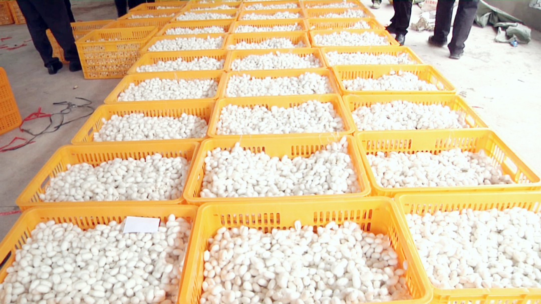 在进化镇红安村蚕茧收购现场,蚕农从车上把一袋袋洁白的蚕茧运送到这里交售,另一边,工作人员使用仪器评价系统对蚕茧进行品质鉴定,并根据品质划分等次。