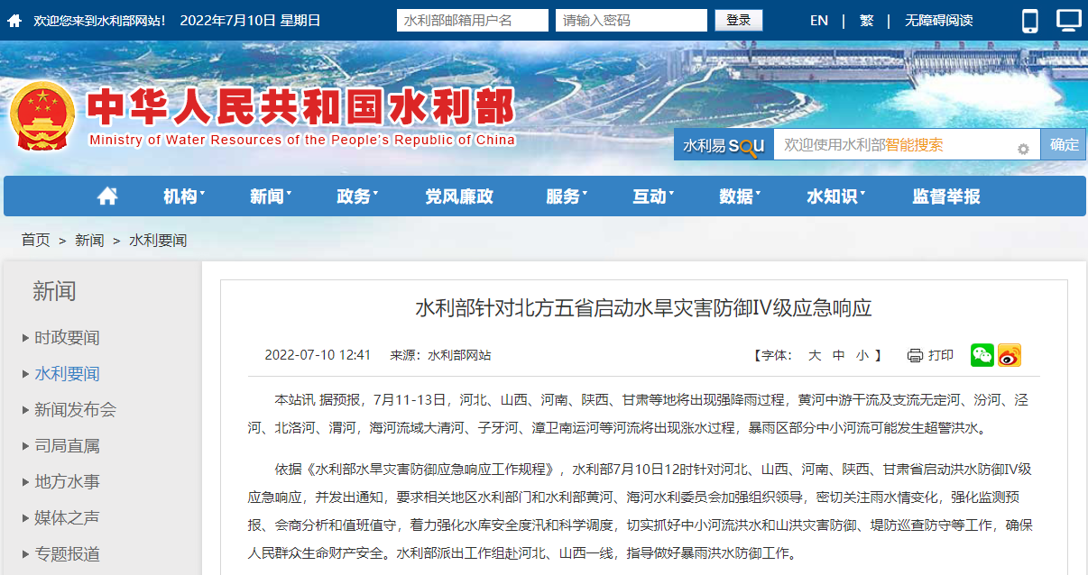 水利部10日12时针对河北、山西、河南、陕西、甘肃启动洪水防御Ⅳ级应急响应,要求相关地区做好洪水防御。
