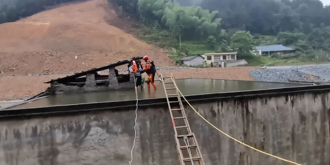 06时42分,消防救援人员到达现场,经过现场侦察询问得知,民房四周均是洪涝积水,积水约有1米多深,群众被困房顶无法自救。了解现场情况后,指挥员立即下达救援命令:由2名救援人员配合民警进行现场警戒,2名救援人员利用安全绳做好安全防护,2名救援人员利用6米拉梯开辟救援通道,再由1名同志通过拉梯到达房顶群众被困所在位置对被困群众实施救援。命令下达后,救援人员迅速展开救援,经过7分钟的紧张救援,成功将被困群众救出。