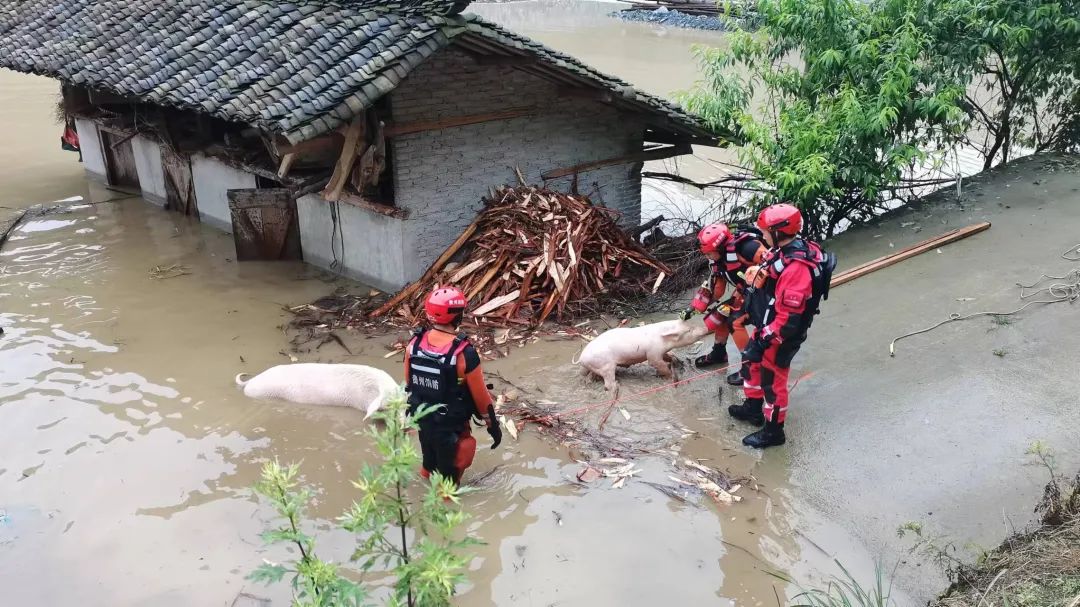 被困人员救出后,她向救援人员求助,称还有4头猪被困在猪圈内,1条狗被困在猪圈门口,希望消防救援人员一并帮助救援,以减少损失。掌握情况后,现场指挥员随即安排人员,整理好个人防护装备后,到猪圈所在位置,将被困在猪圈内的4头猪和1只狗疏散到安全区域。至此,整个救援行动圆满结束。