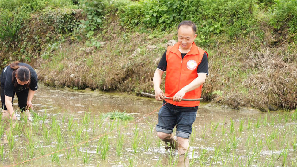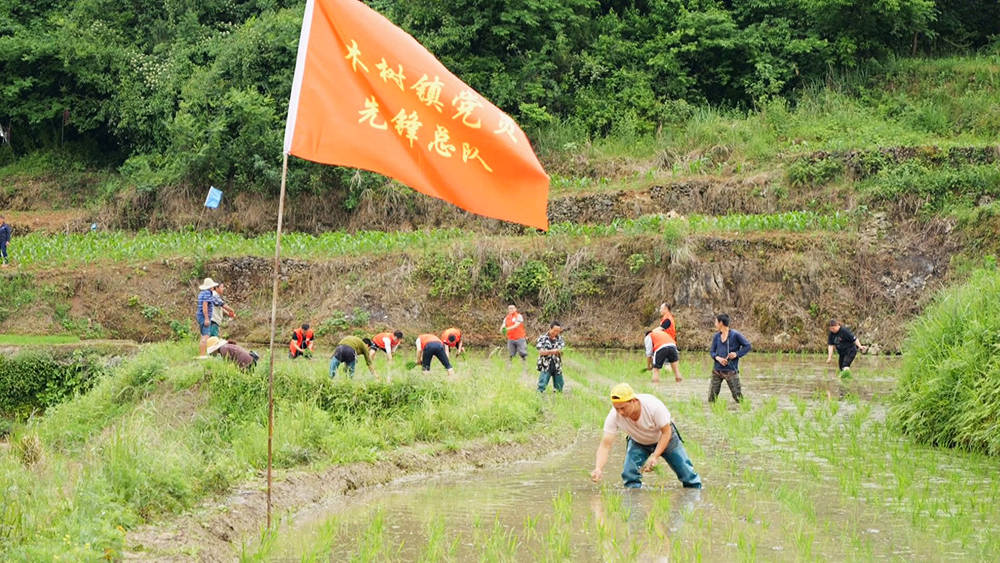 近日,记者来到木树镇潮水村,映入眼帘的便是近300亩的贡米和稻花鱼种养殖示范基地,由木树镇、潮水村部分党员干部、团员和村民组成的服务队正在田里忙碌耕作,一会儿的功夫,错落有致的梯田里就插满了一行行嫩绿的秧苗。
