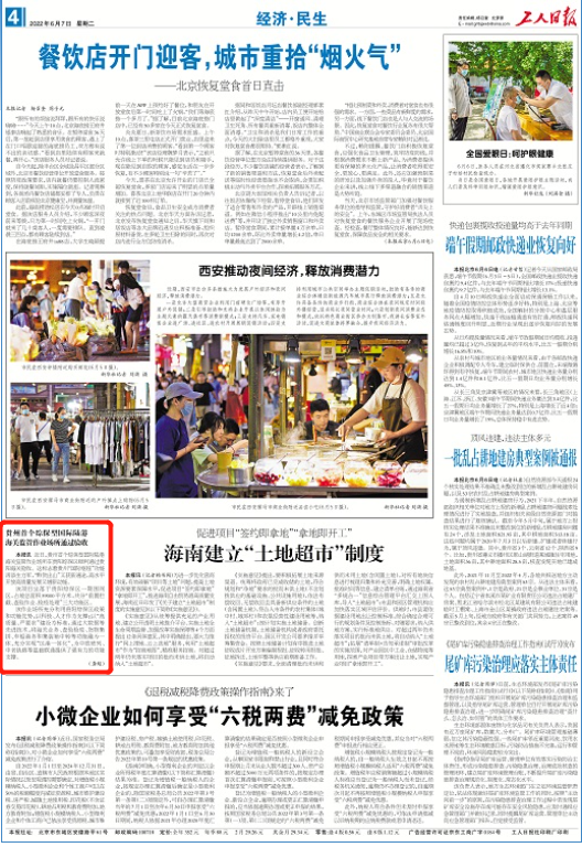 今天(6月7日),《工人日报》刊发新闻《贵州首个综保型国际陆港海关监管作业场所通过验收》。