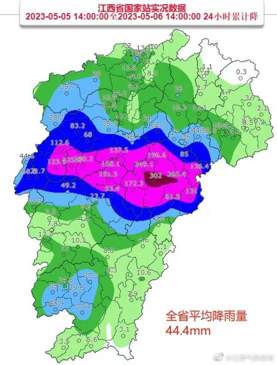 5月5日14时至6日14时,江西全省平均降雨量达44.4毫米,其中累计降雨量最大的抚州市全市平均降雨量达148.2毫米,抚州市宜黄县24小时降雨量高达302毫米,已达到特大暴雨量级。来源:@江西气象