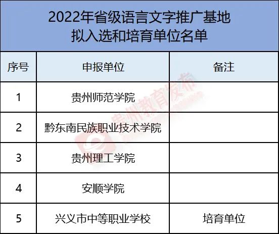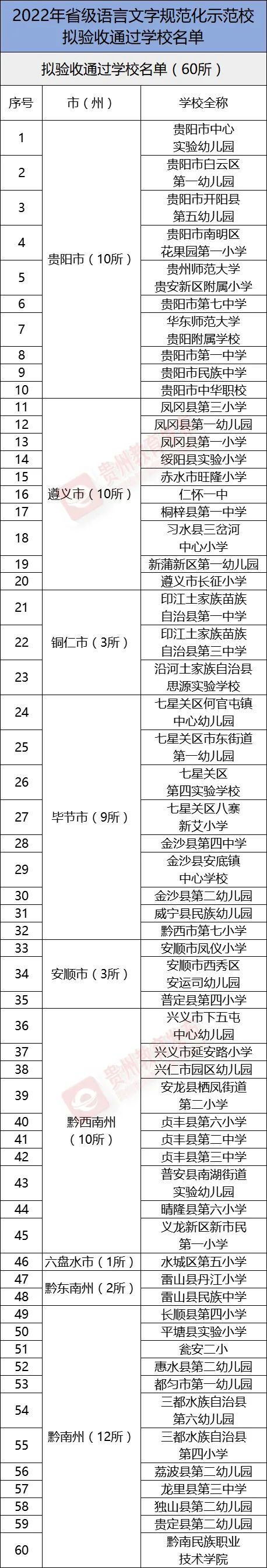 近日,省教育厅组织专家对申报省级语言文字规范化示范校的82所学校、申报省级语言文字推广基地的9家学校(单位)进行了验收评审,经专家组综合评议,拟认定60所学校为省级语言文字规范化示范校,4所学校为省级语言文字推广基地,1所学校为省级语言文字推广基地培育单位。现将具体名单予以公示。