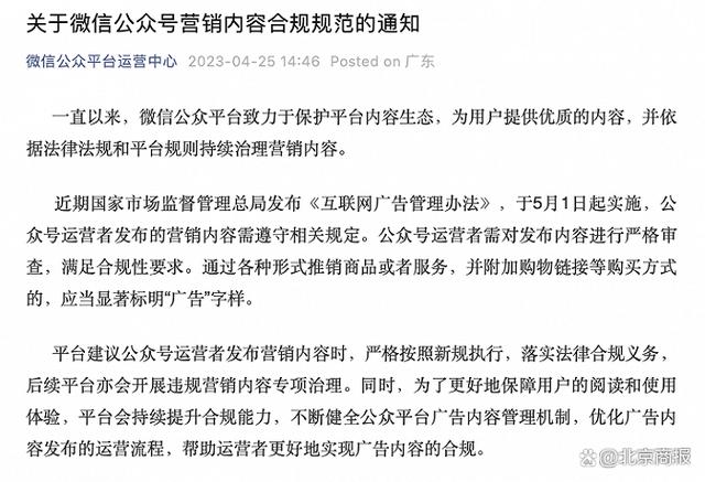 4月25日,微信公众平台运营中心发布通知称,近期国家市场监督管理总局发布《互联网广告管理办法》,于5月1日起实施,公众号运营者发布的营销内容需遵守相关规定。平台建议公众号运营者发布营销内容时,严格按照新规执行,落实法律合规义务,后续平台亦会开展违规营销内容专项治理。