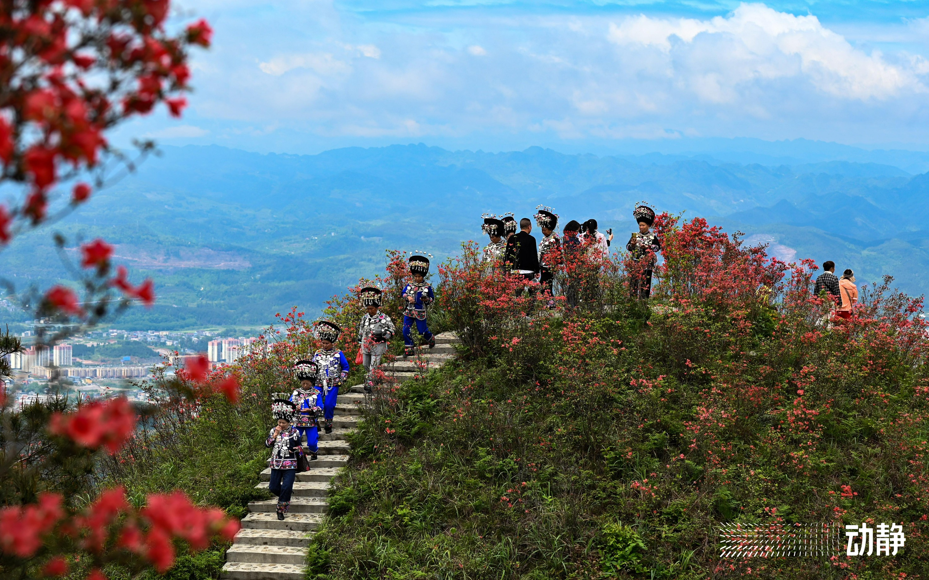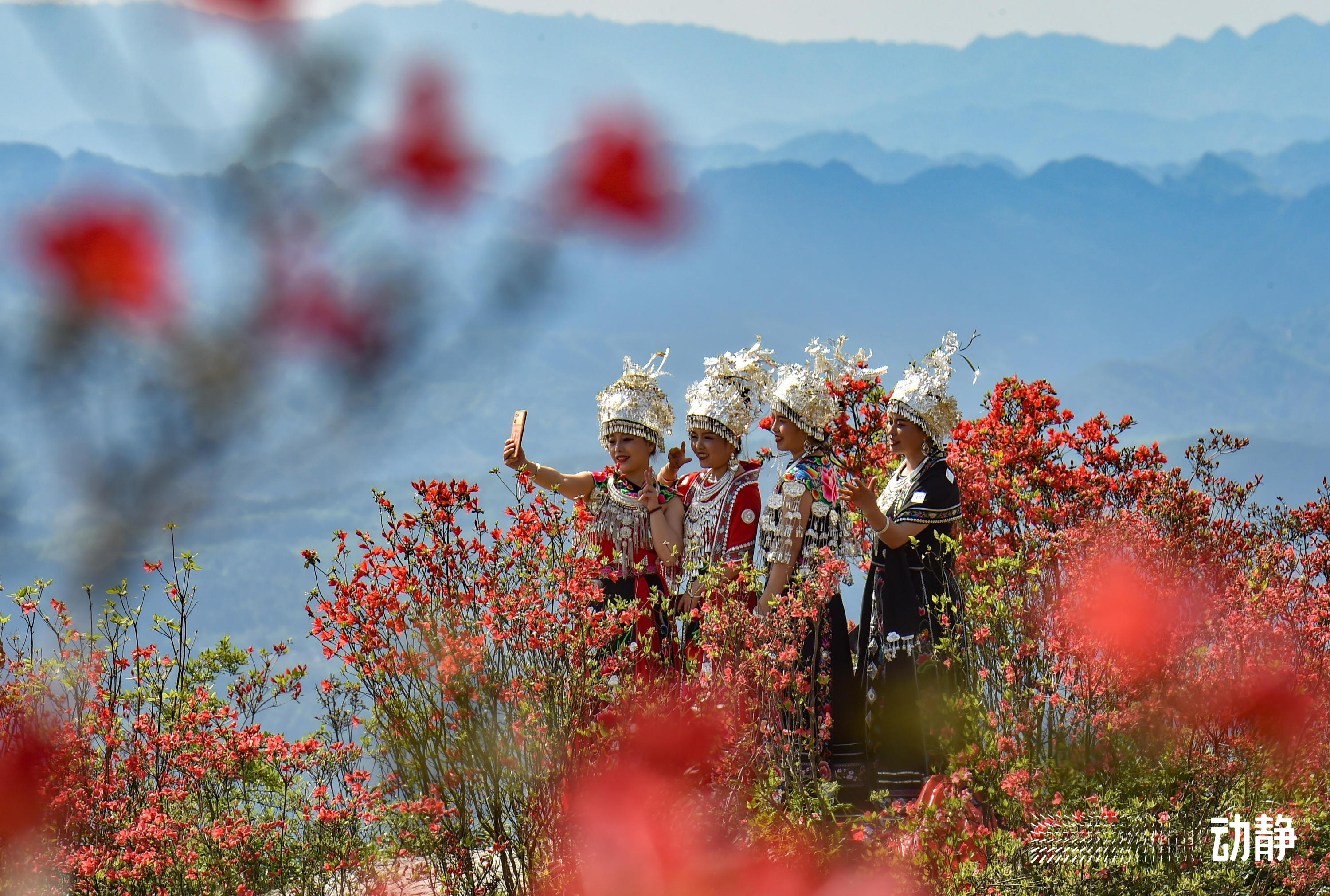 映山红又名杜鹃花,山坡上,一株株映山红开得正艳,灿若红霞,一派花团锦簇的景象。不少的游客身着苗族盛装,行走在花海里,显得人比花娇。在花丛中,游客们唱歌、拍照,玩得不亦乐乎。