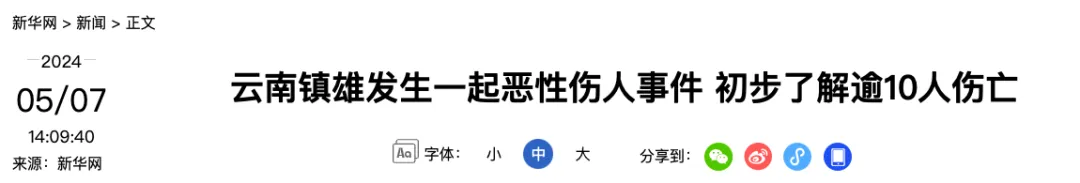 另据央视新闻报道,总台记者从权威渠道获悉,今天(7日)中午,云南省昭通市镇雄县一医院发生持刀伤人事件。