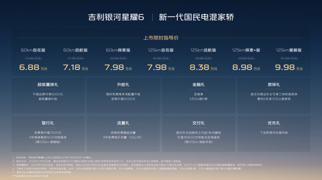 10月30日,新一代国民电混家轿吉利银河星耀6全球上市。新车共推出60km自在版、60km启航版、60km探索版、125km自在版、125km远航版、125km探索+版、125km星舰版7个版型,上市限时指导价为6.88万元—9.98万元。