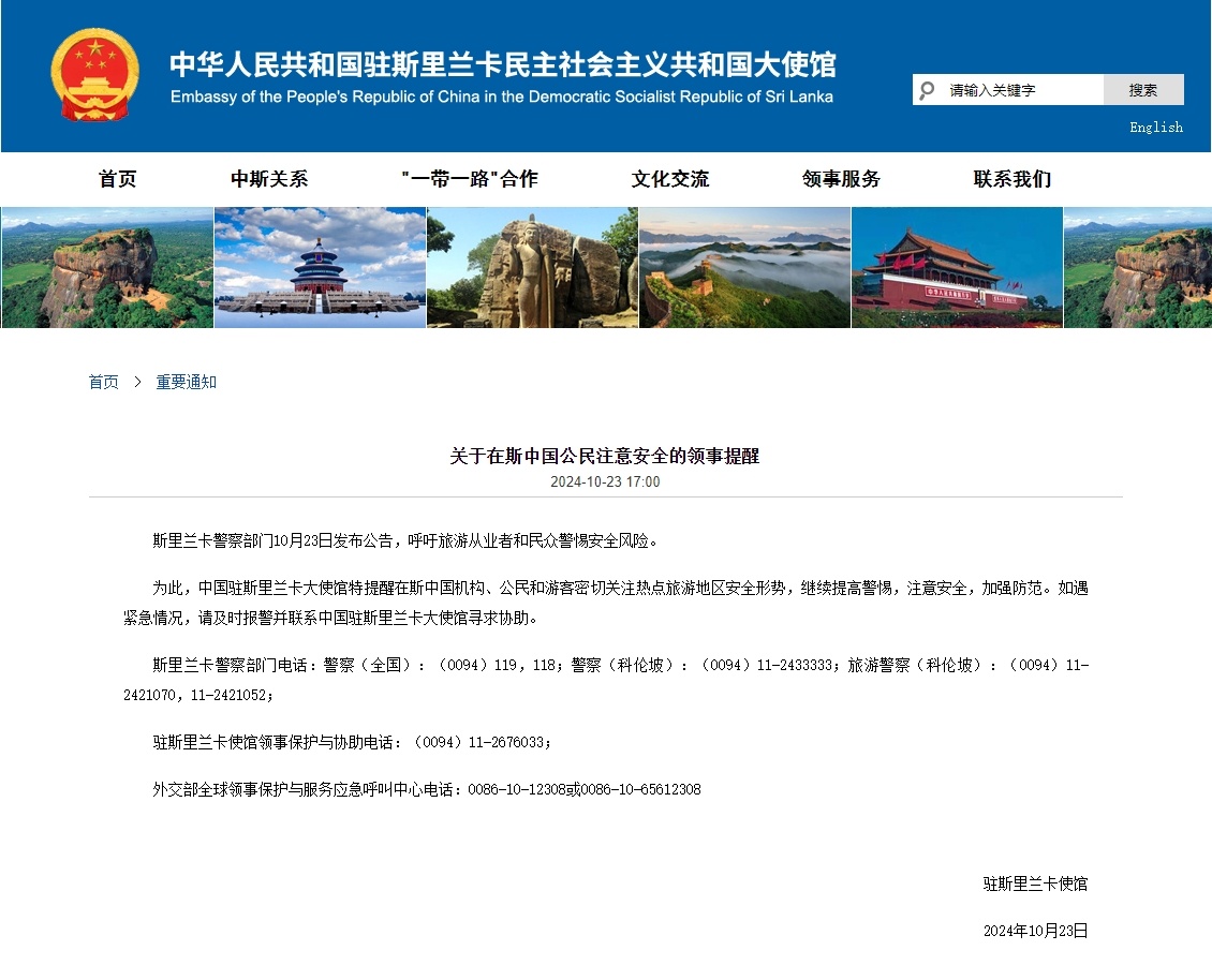10月23日,中国驻斯里兰卡大使馆发布领事提醒,表示根据斯里兰卡警察部门10月23日发布的公告,呼吁旅游从业者和民众警惕安全风险。
