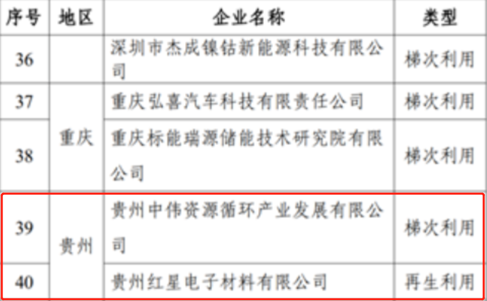 11月16日,工信部就拟公告的符合废旧动力蓄电池综合利用行业规范条件企业名单(第四批)公开征求意见,在业内,这也被称为动力电池回收行业的白名单,意见共涉及企业四十一家,贵州中伟资源循环产业发展有限公司和贵州红星电子材料有限公司上榜,利用类型分别为梯次利用和再生利用。