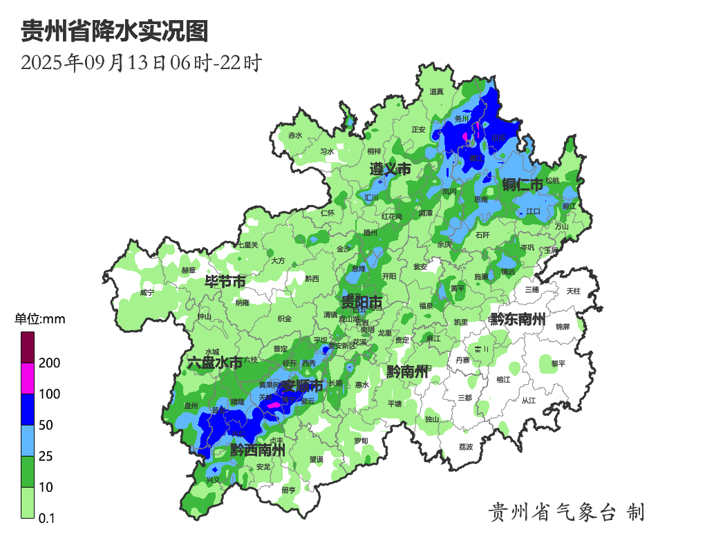 9月13日06时至22时,大暴雨出现在安顺市的关岭、镇宁,遵义市的务川、正安,铜仁市的德江、沿河,黔西南州的兴仁7县域内的10个观测站(最大为兴仁市巴铃镇巴铃花坝124.7毫米),暴雨出现在六盘水市的盘州,安顺市的关岭、平坝、紫云、西秀、镇宁,遵义市的凤冈、务川、桐梓、正安、汇川,铜仁市的德江、思南、松桃、江口、沿河、碧江,黔南州的惠水,黔西南州的兴义、兴仁、普安、晴隆、贞丰23县域内的188个观测站,大雨有345个观测站,中雨有605个观测站,小雨有1813个观测站。41个县(市、区)298站次出现短时强降水,小时雨强最大为德江县长丰乡长丰农晨57.7毫米(出现在13日07时至08时)。
