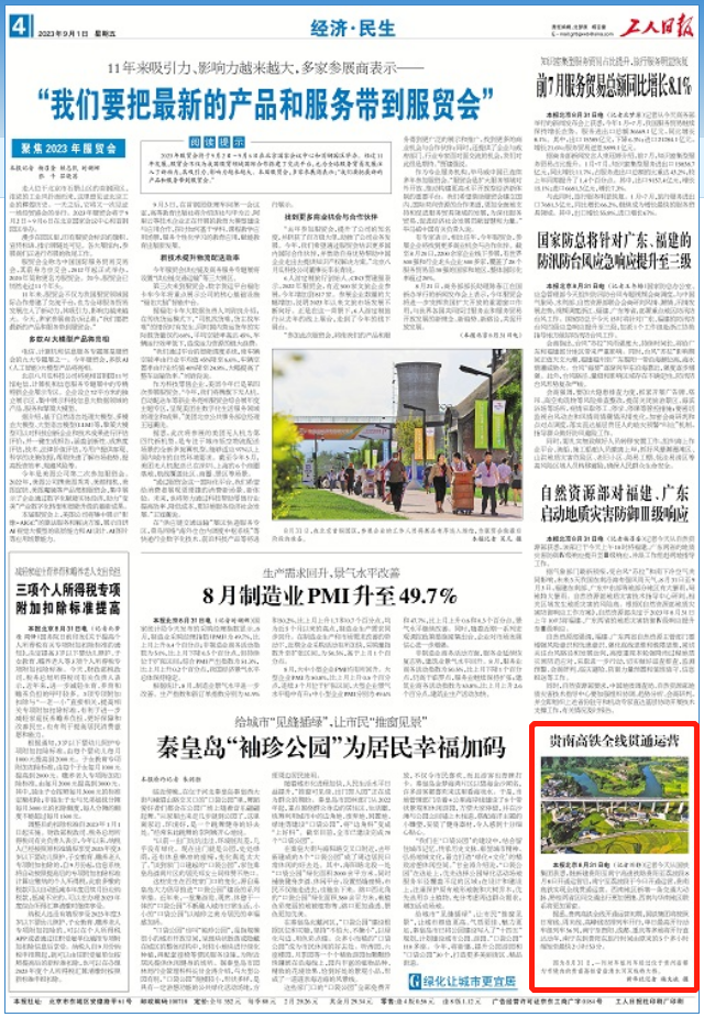 今天(9月1日),工人日报刊发新闻《贵南高铁全线贯通运营》。