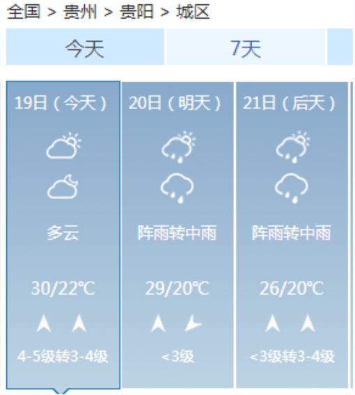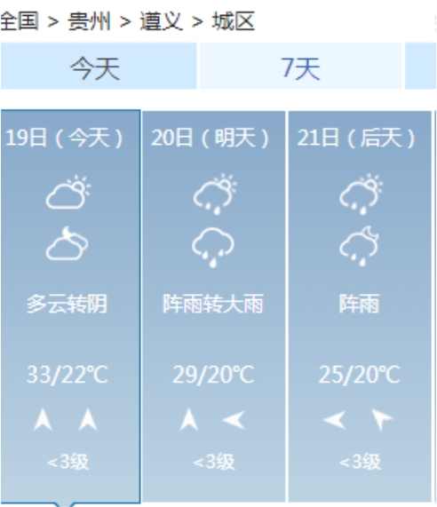 今天夜间到明天白天,省的西北部和北部多云转阴天有阵雨或雷雨,其中毕节市中北部、遵义中北部和铜仁西北部有中到大雨,部分乡镇暴雨,个别乡镇大暴雨,气温下降2-6℃,其余地区多云间阴天有分散阵雨或雷雨;