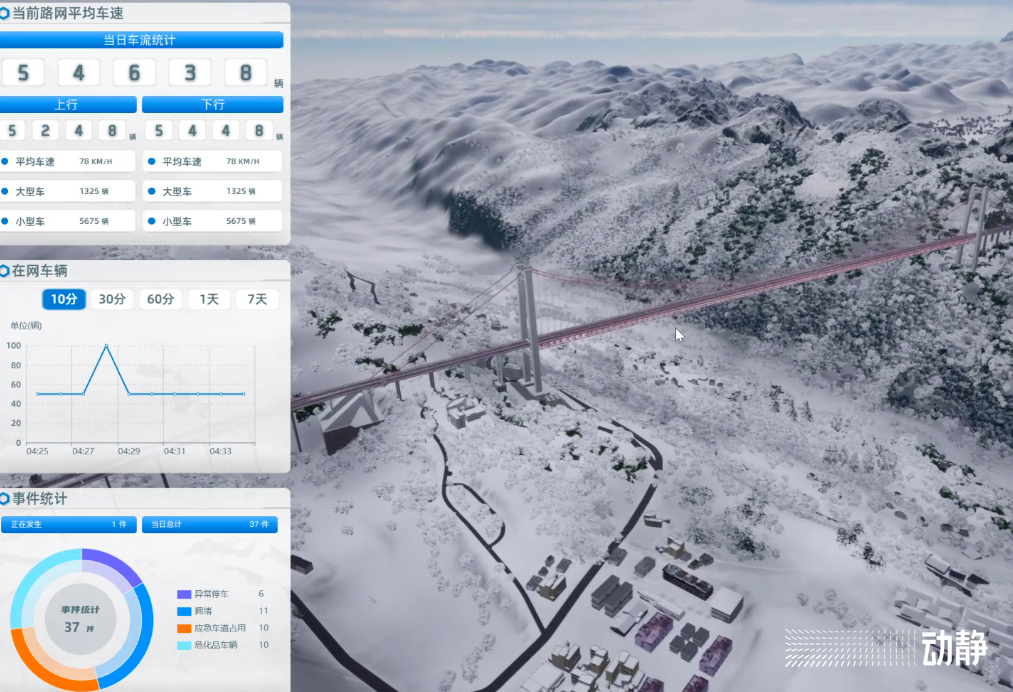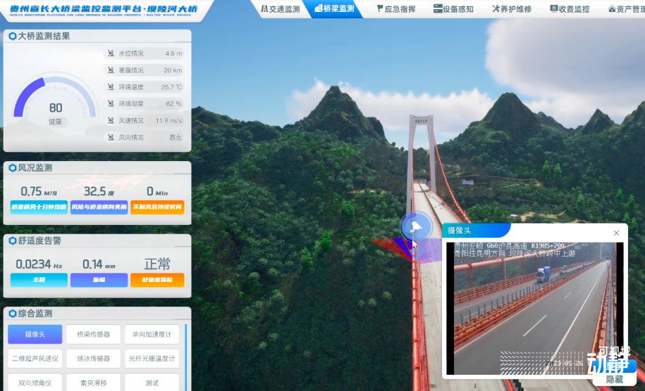 坝陵河大桥上的每一根索缆、钢筋的建模都在数字孪生平台上,而安装在桥上的摄像探头能够实时传递大桥上行驶车辆的状况,它还可以模拟坝陵河大桥在春夏秋冬不同场景下,温度、风向、凝冻等因素对大桥的影响。