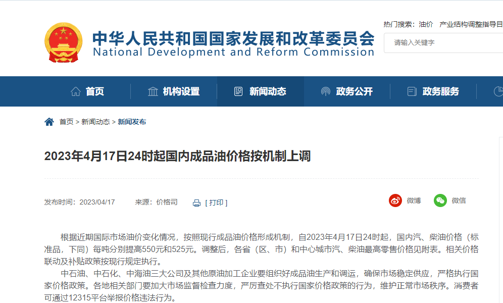 据国家发改委消息,根据近期国际市场油价变化情况,按照现行成品油价格形成机制,自2023年4月17日24时起,国内汽、柴油价格(标准品,下同)每吨分别提高550元和525元。