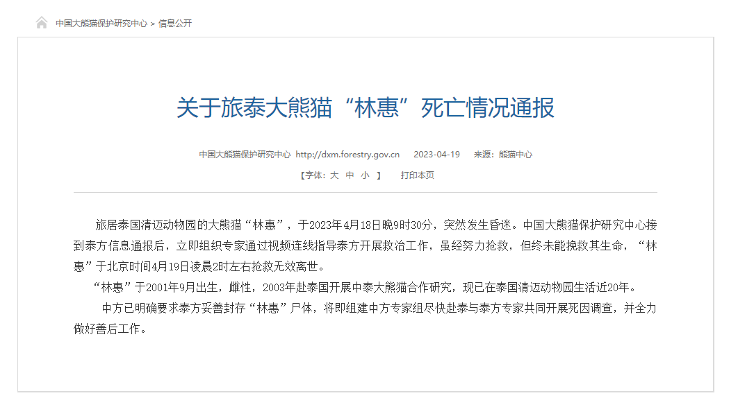 旅居泰国清迈动物园的大熊猫“林惠”,于2023年4月18日晚9时30分,突然发生昏迷。中国大熊猫保护研究中心接到泰方信息通报后,立即组织专家通过视频连线指导泰方开展救治工作,虽经努力抢救,但终未能挽救其生命,“林惠”于北京时间4月19日凌晨2时左右抢救无效离世。