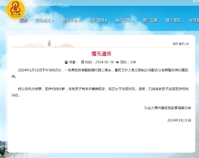 2024年1月31日下午5时15分,一名男性游客翻越围栏爬上佛头,景区工作人员立即制止并配合公安民警将其劝离现场。