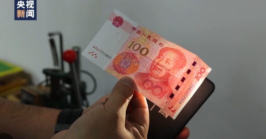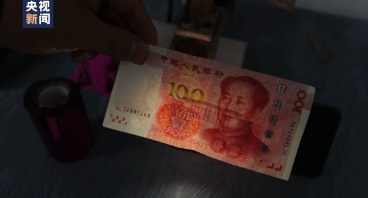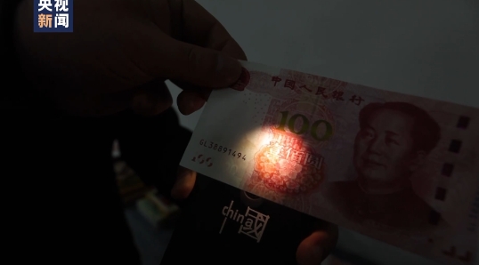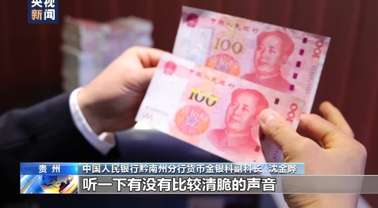 中国人民银行黔南州分行货币金银科副科长沈金晔:首先是听,真币有比较清脆的声音。二就是摸一下领子这里,真币有比较明显的凹凸感。三看,先看一下100的光彩光变数字,真币在光线下,光线是随着我们的视线移动的,整个光的角度在不停变化;然后看白色的水印区,真币可以明显看到有立体感。