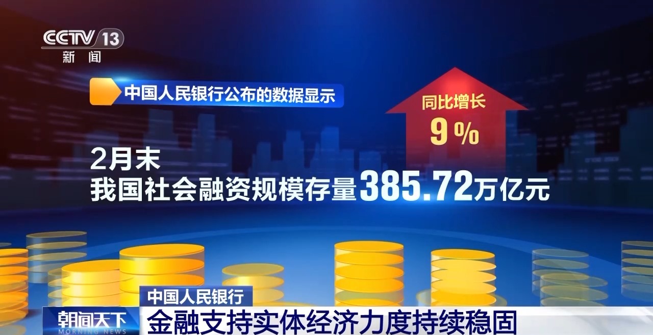 从社会融资规模看,2月末,社会融资规模存量385.72万亿元,同比增长9%,其中,对实体经济发放的人民币贷款余额241.29万亿元,同比增长9.7%。