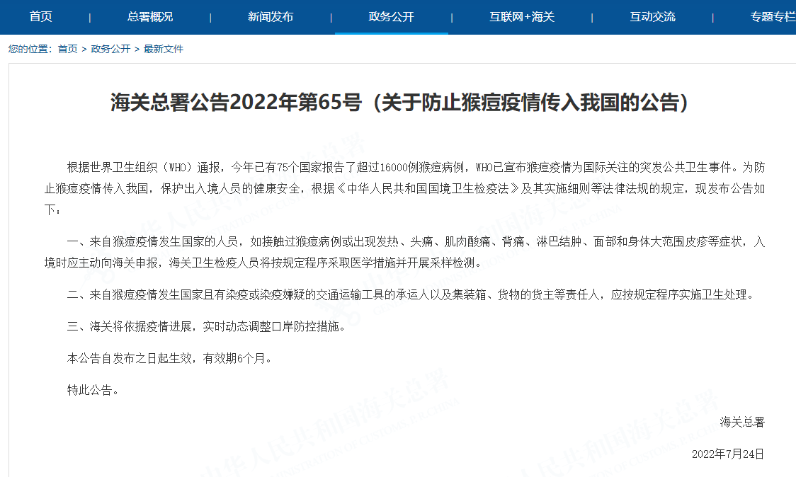 据海关总署网站25日消息,根据世界卫生组织(WHO)通报,今年已有75个国家报告了超过16000例猴痘病例,WHO已宣布猴痘疫情为国际关注的突发公共卫生事件。为防止猴痘疫情传入我国,保护出入境人员的健康安全,根据《中华人民共和国国境卫生检疫法》及其实施细则等法律法规的规定,现发布公告如下: