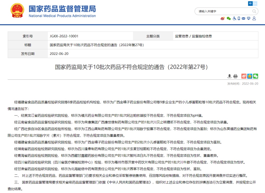 据国家药监局官网,经福建省食品药品质量检验研究院等8家药品检验机构检验,标示为广西金嗓子药业股份有限公司等9家企业生产的小儿感冒颗粒等10批次药品不符合规定。现将相关情况通告如下: