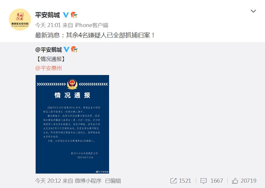 据@平安鹅城 19日晚最新消息,据初步调查,主要犯罪嫌疑人洛某龙(男,23岁)与其女友及4名同乡行至案发地时,因发生争执进而殴打女友,附近宵夜档主谭某夫妇上前制止,期间被洛某龙及同乡打伤。