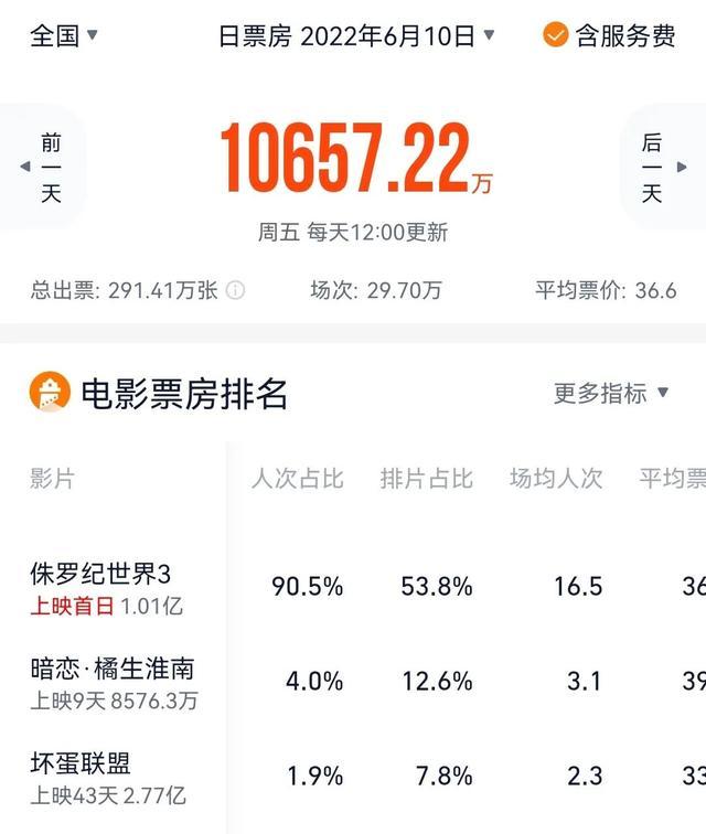 在《侏罗3》的带动下,截至6月11日16时30分左右,国内电影票房再度过亿。