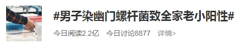 24日,#男子染幽门螺杆菌致全家老小阳性#的话题登上微博热搜。