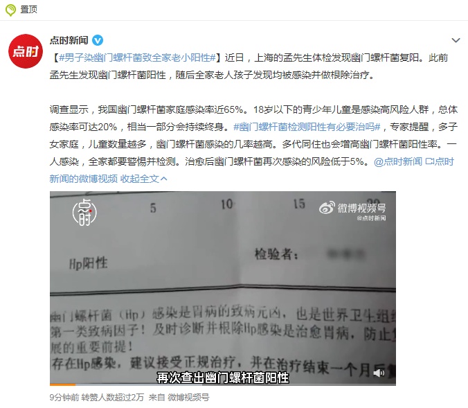 据青岛广电@点时新闻 报道,近日,上海的孟先生体检发现幽门螺杆菌复阳。此前孟先生发现幽门螺杆菌阳性,随后全家老人孩子发现均被感染,并做根除治疗。