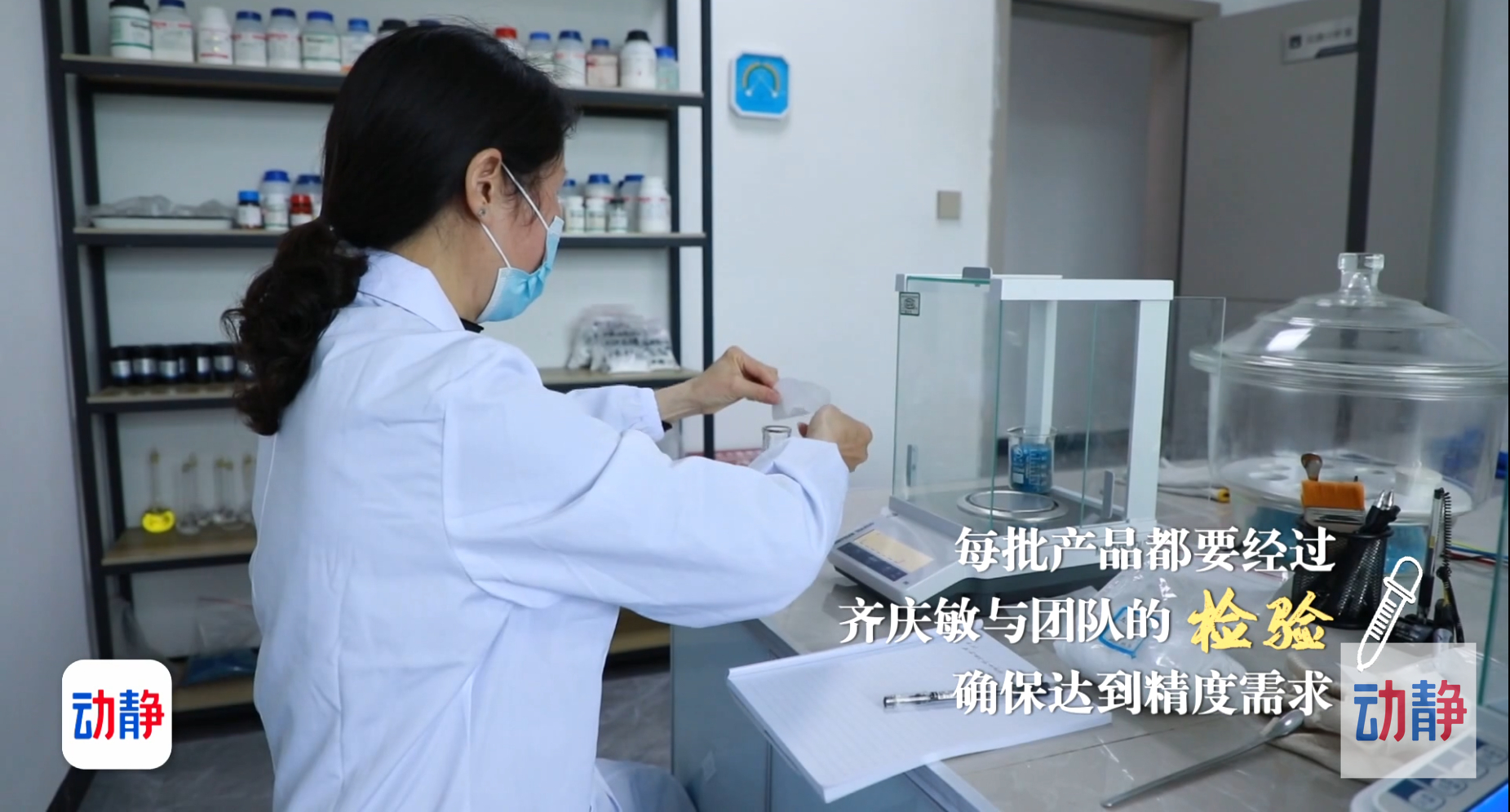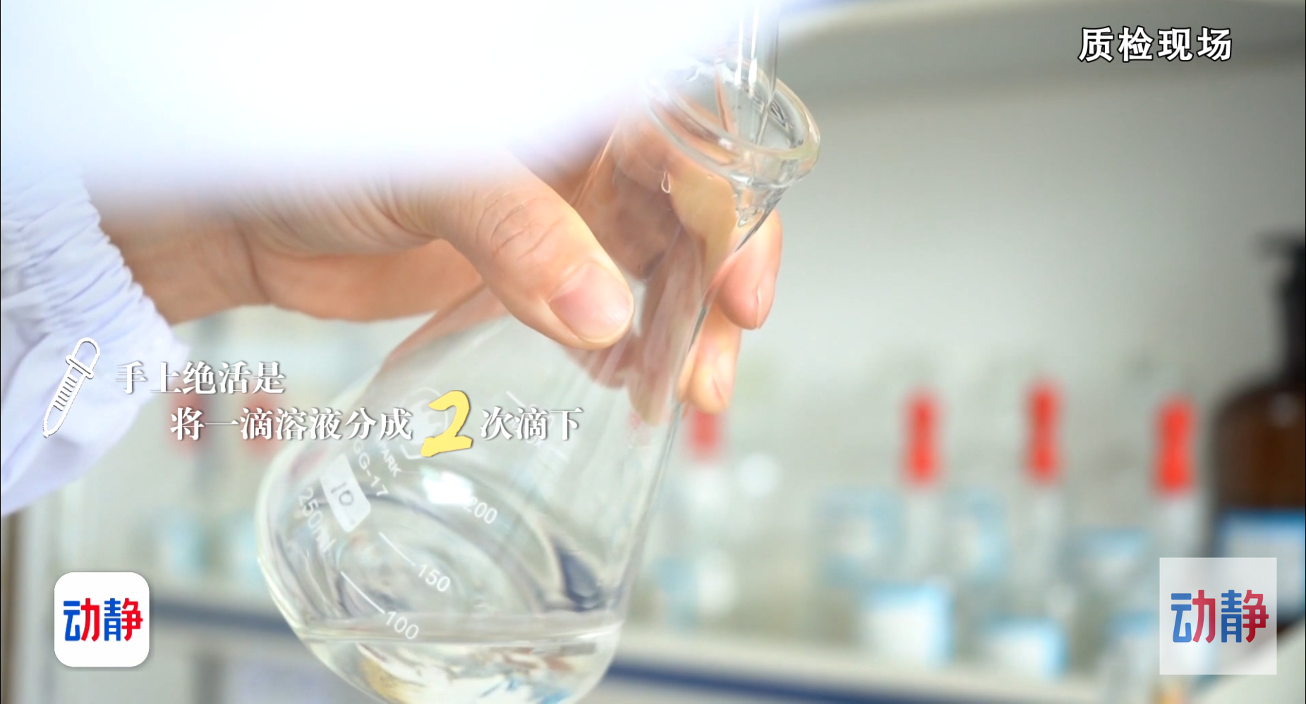 做化学实验,是齐庆敏质检工作中重要的一环,26年的工作经验,每天的滴定动作,滴定管捏多快?要使多大力?齐庆敏的手上动作已经形成了一种肌肉记忆。一滴溶液有0.04毫升,而齐庆敏可以将一滴溶液分成2次滴,且保证数量精确。