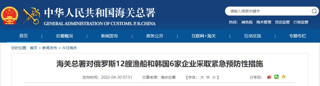 海关总署对俄罗斯12艘渔船和韩国6家企业采取紧急预防性措施
