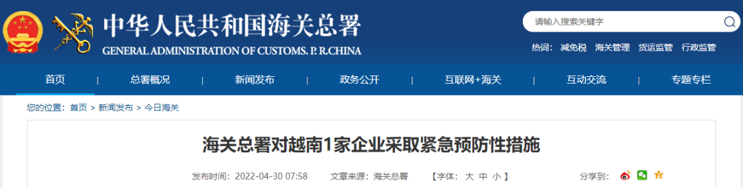 海关总署对越南1家企业采取紧急预防性措施
