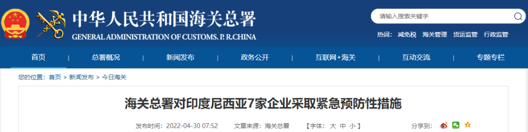 海关总署对印度尼西亚7家企业采取紧急预防性措施