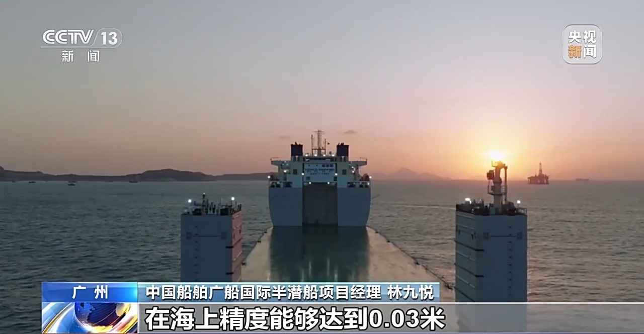 中国船舶广船国际半潜船项目经理 林九悦:半潜船载重能力达到6.5万吨,甲板面积接近两个标准足球场的大小,自动化程度高,含有高精度海上动力定位系统,在海上精度能够达到0.03米,可以极大程度地满足海洋工程装备安装运输的高精度要求。