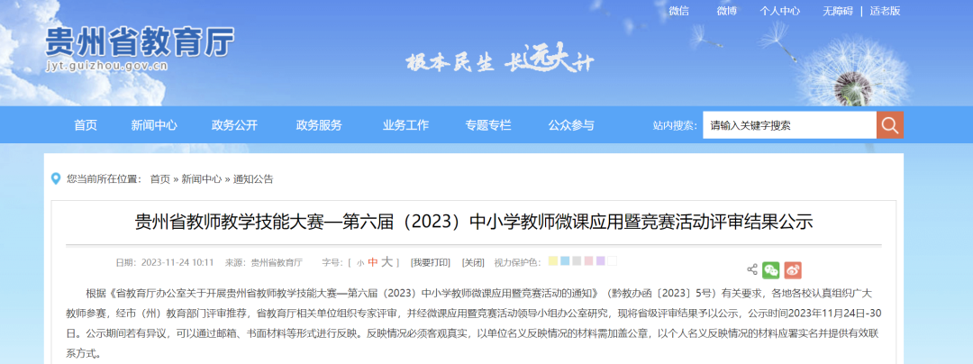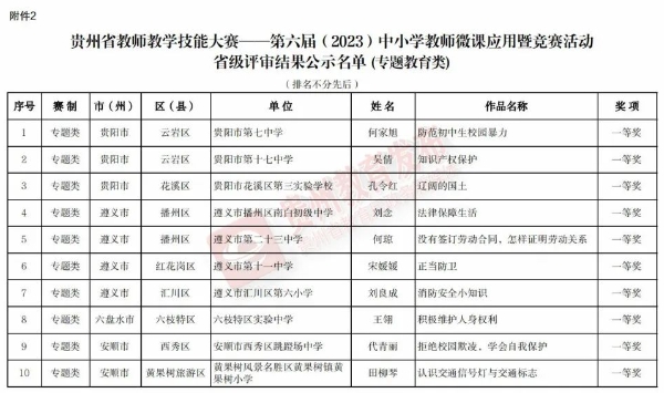 近日,贵州省教师教学技能大赛—第六届(2023)中小学教师微课应用暨竞赛活动圆满结束,现将省级评审结果予以公示,公示时间为2023年11月24日-30日。具体一起来看——