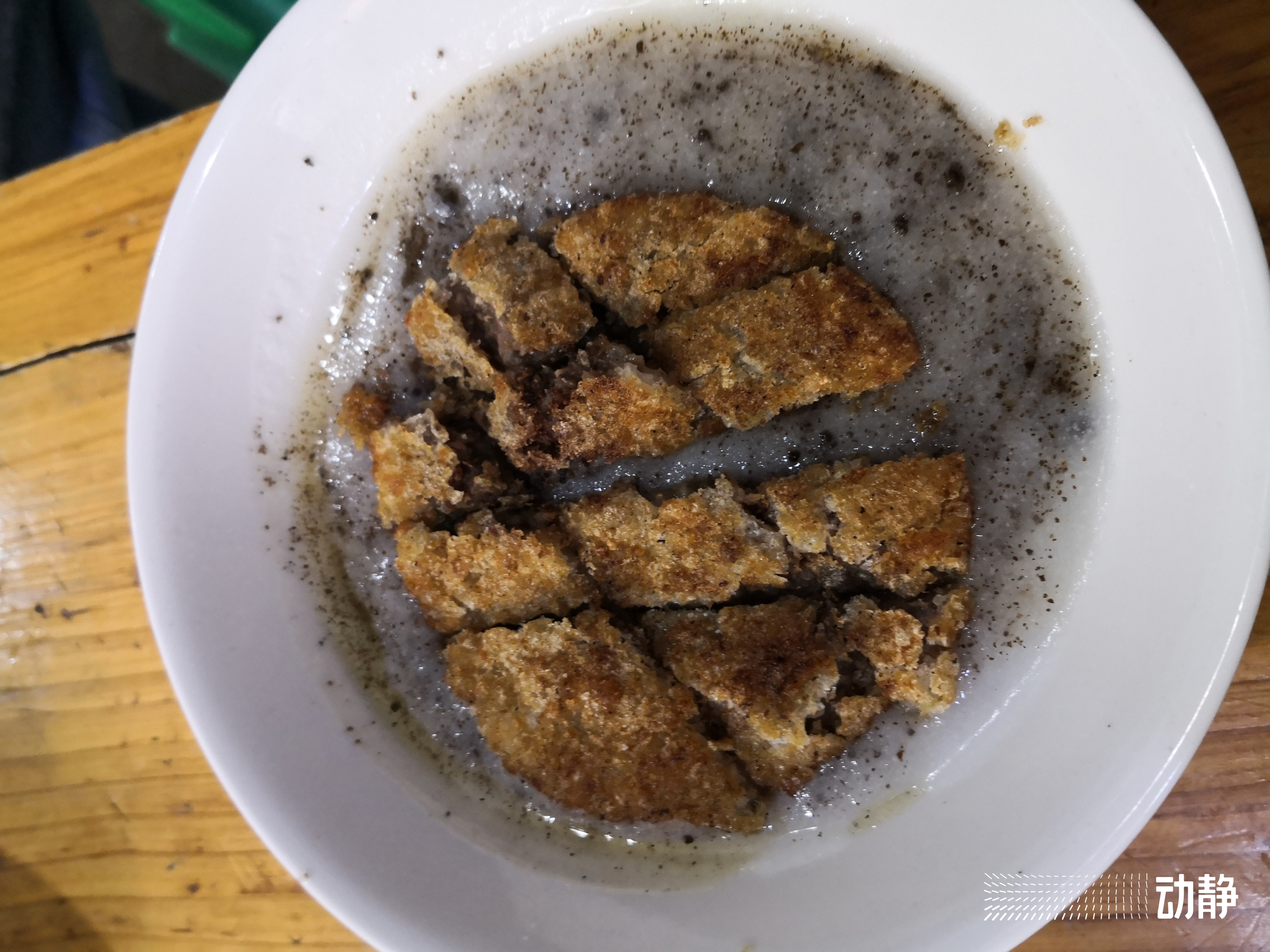 第一碗下肚的东西,是安顺极有特色的油炸粑稀饭。所谓油炸粑,其实就是贵阳人熟悉的豆沙窝,只是稍小一点点,现炸出锅,拿刀哐哐哐切成块,放进一碗米糊里,再淋上热油。一口下去,立马就有了暖意。