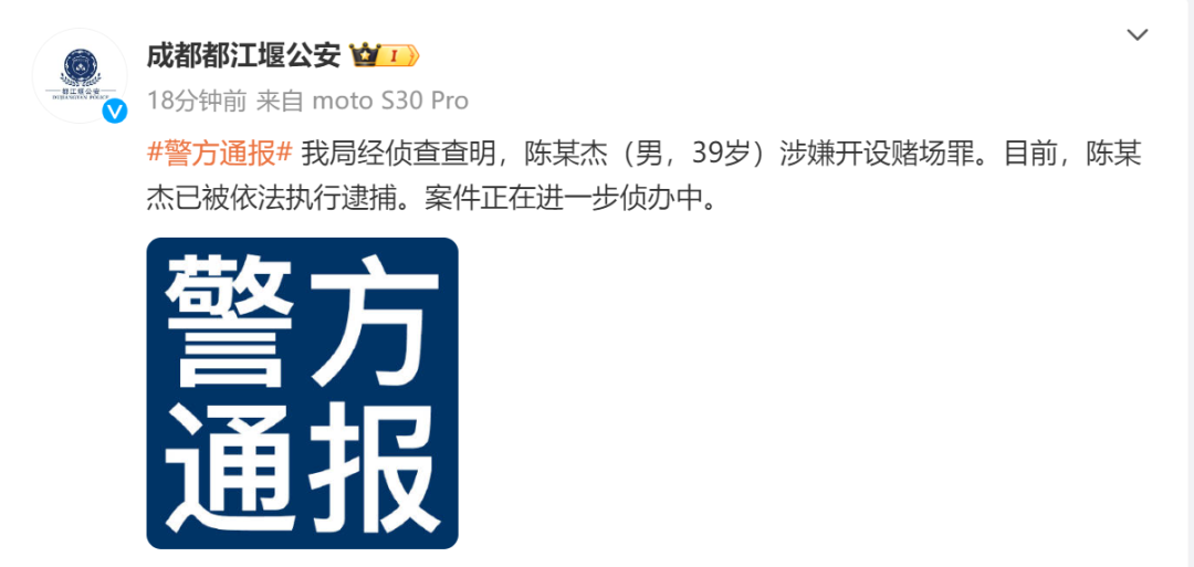 成都都江堰公安微博发布警方通报:我局经侦查查明,陈某杰(男,39岁)涉嫌开设赌场罪。目前,陈某杰已被依法执行逮捕。案件正在进一步侦办中。