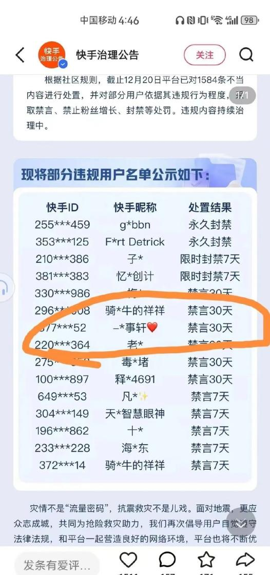 据有媒体报道,平台已对涉事账号作出处罚,据快手发布的治理公告显示,对涉事账号作出的处罚为:禁言30天。