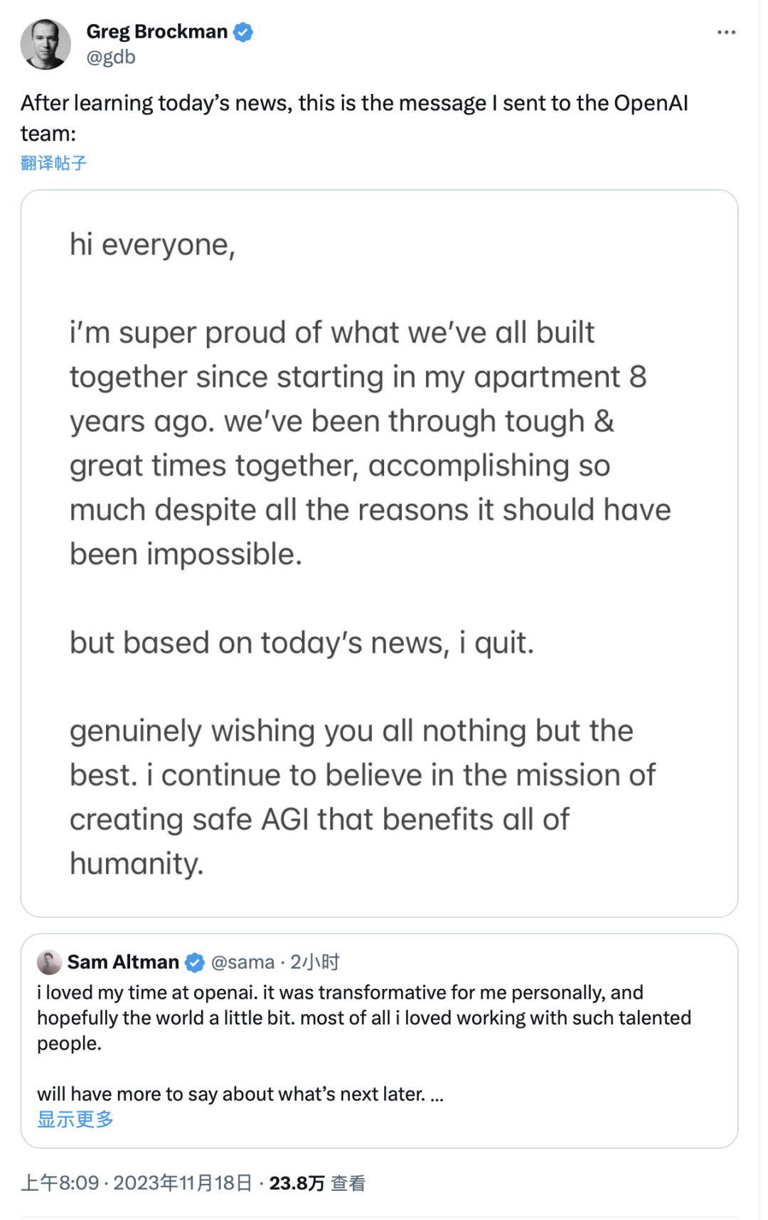 在被罢免后,有“ChatGPT之父”称号的奥特曼在X(原推特)平台上发文称:“我很喜欢在openai 的时光。这对我个人来说是变革性的,希望对世界也有一点变革。最重要的是,我喜欢与这些才华横溢的人一起工作。稍后将有更多关于接下来的事情要说。”