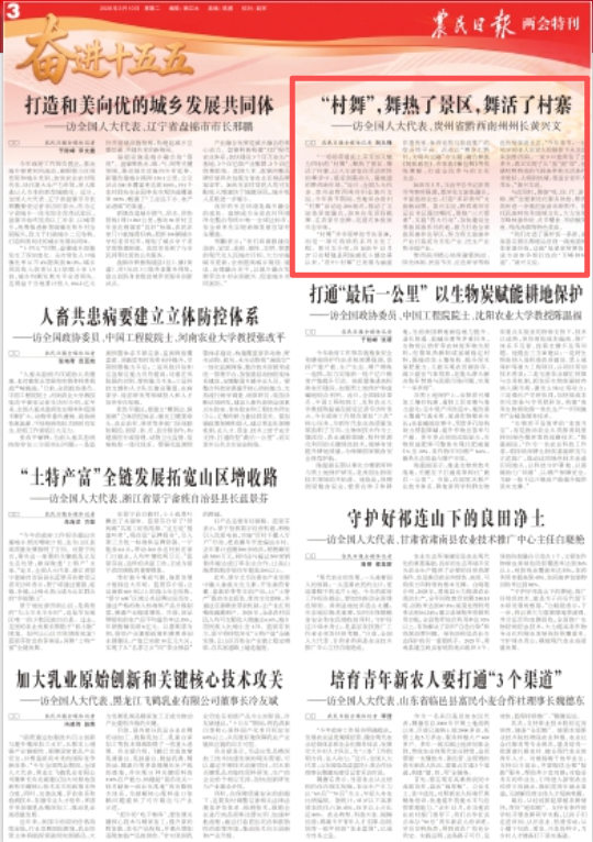 “一场场带着泥土芬芳却又魅力四射的‘村舞’,舞热了景区、舞活了村寨,让八方游客在灵动欢快的舞步中,感受到最动人、最地道的黔西南年味。”近日,全国人大代表、贵州省黔西南州州长黄兴文说,今年春节期间,当地举办贵州“村舞”活动近200场次,推动了文旅体深度融合,游客在花田间跳舞、在农家乐尝鲜,沉浸式体验原生态年味。