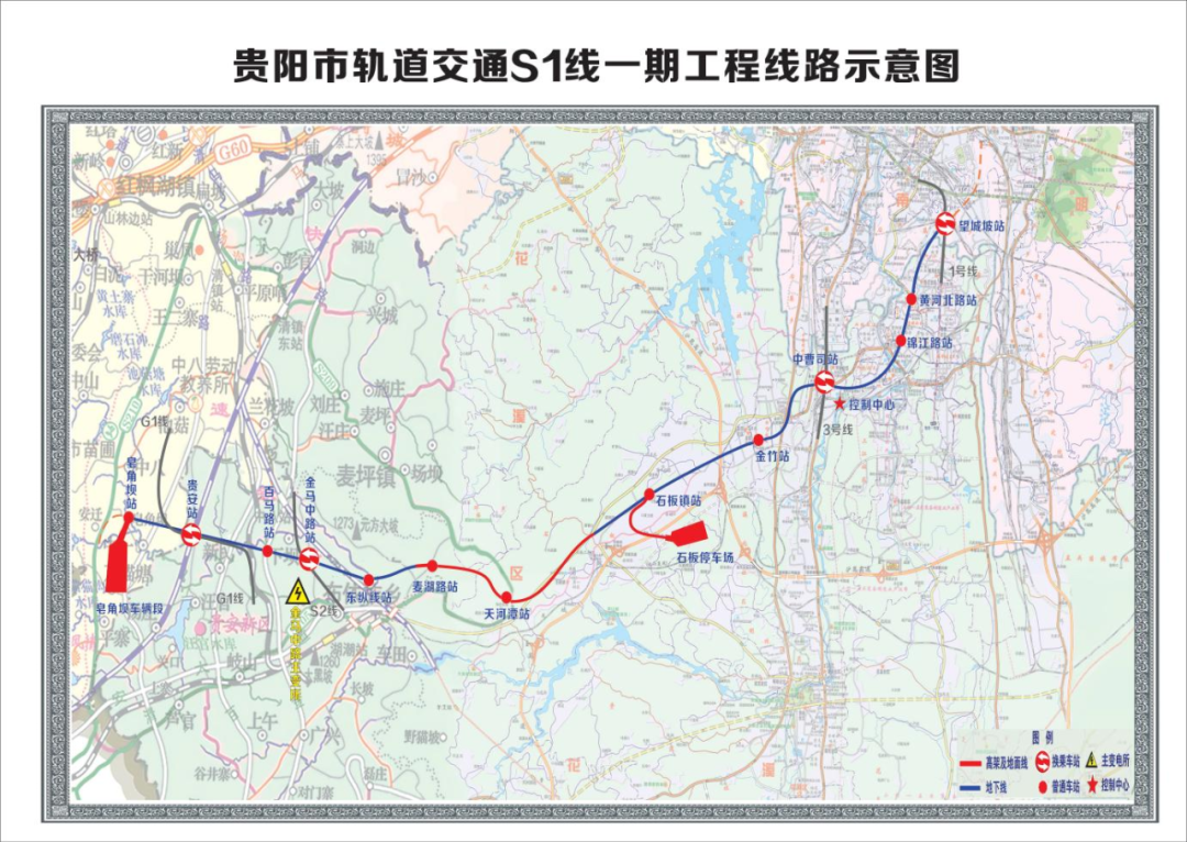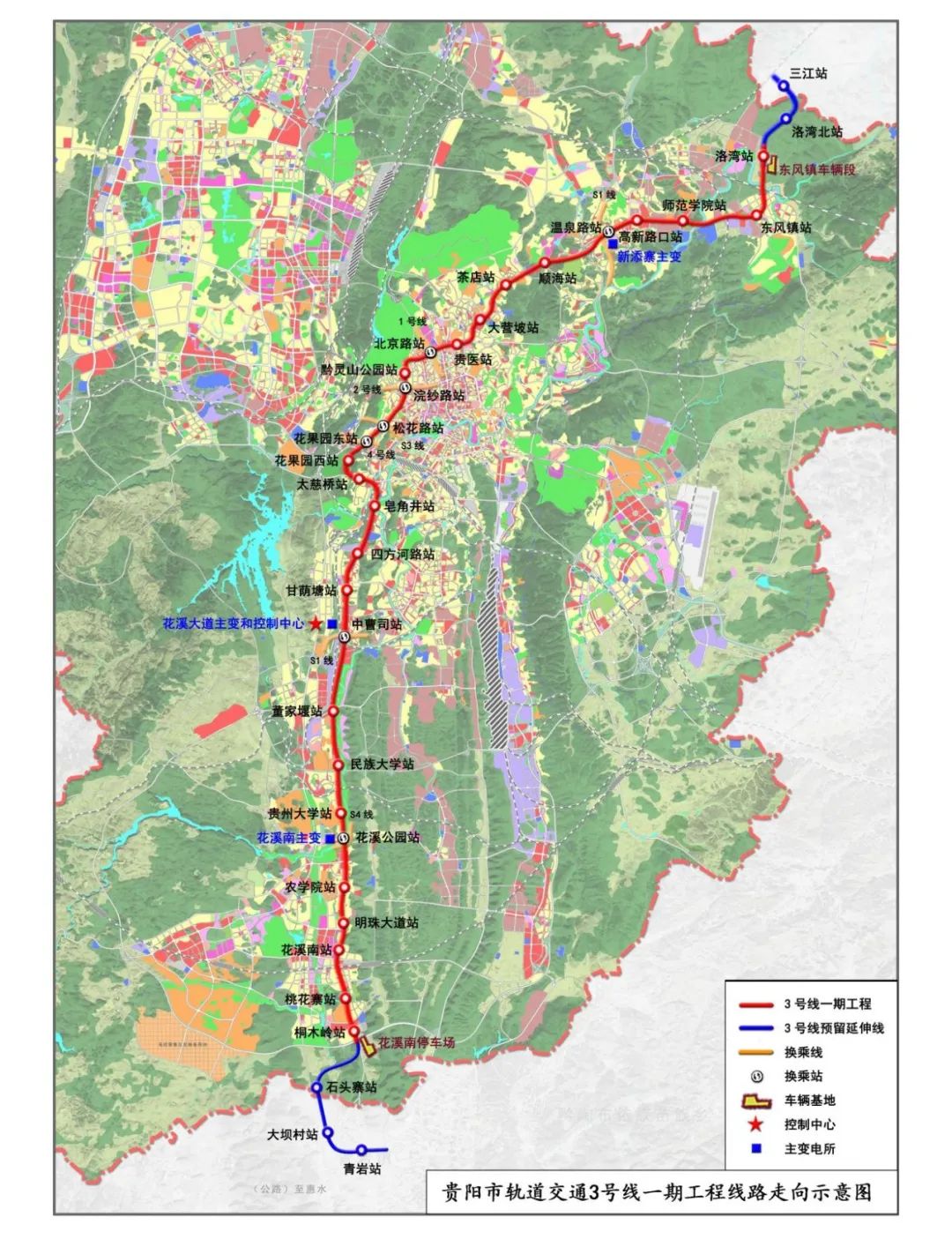 贵阳市轨道交通3号线一期43.03公里,设站29座。起点为花溪环城高速公路北侧的桐木岭站,终点为乌当区洛湾站,经过花溪区、南明区、云岩区、乌当区四个行政区。贵阳轨道交通S1线一期30.32公里,设站13座,起于贵安新区皂角坝站,向东经石板镇、金竹镇进入经开区后沿黄河路北上,止于望城坡站,经过贵安新区、花溪区、经开区及南明区四个行政区。