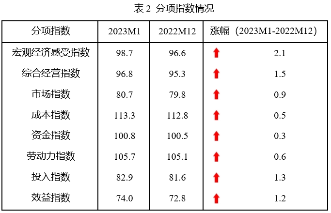 1月份,8个分项指数也是全部上升,其中,宏观经济感受指数、成本指数和投入指数连续两个月上升,综合经营指数、市场指数、劳动力指数、资金指数和效益指数止跌回升。
