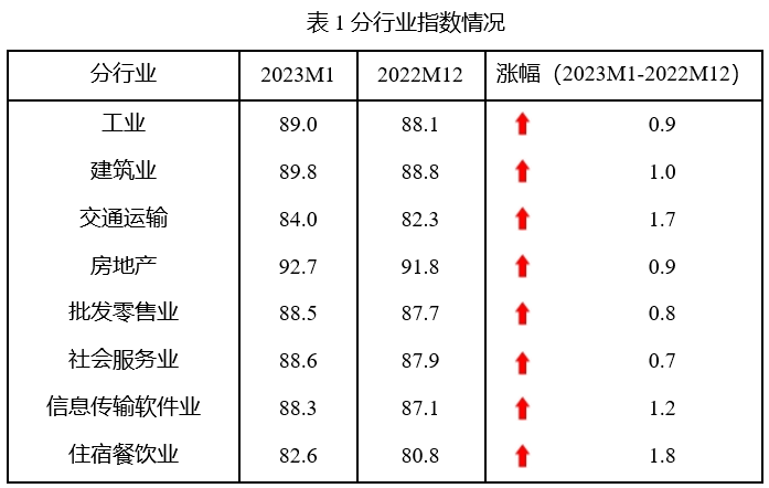 随着疫情形势好转,1月份8个行业指数均上升,特别是交通运输邮政仓储、住宿餐饮等接触性聚集性行业上升明显,分别比上月上升1.7和1.8点,升幅最大;工业、交通运输邮政仓储业、批发零售业和社会服务业指数止跌回升;建筑业指数由平转升;房地产、信息传输计算机服务软件业和住宿餐饮业指数连续两个月上升。