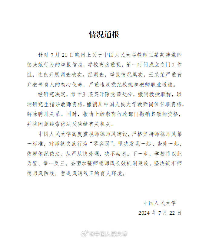 7月22日,@中国人民大学 发布情况通报,全文如下:
