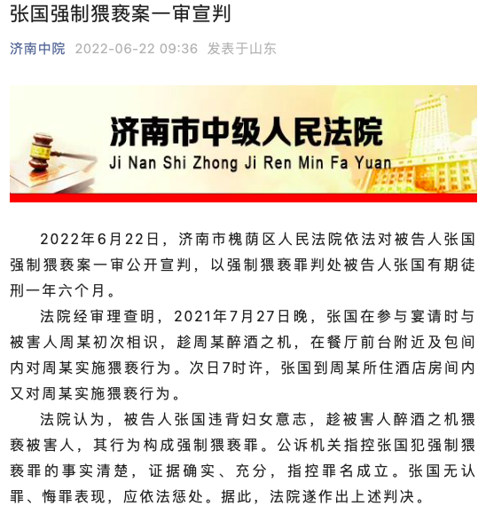 据济南市槐荫区人民法院官方微信消息,2022年6月22日,济南市槐荫区人民法院依法对被告人张国强制猥亵案一审公开宣判,以强制猥亵罪判处被告人张国有期徒刑一年六个月。