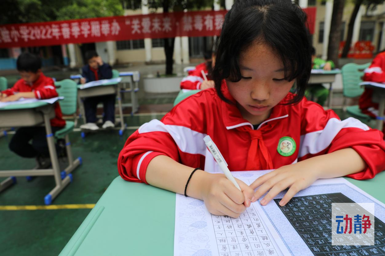 工作人员现场组织学生参加书法活动,活动选出贴近青少年大众、宣传“珍爱生命,远离毒品”书法优秀作品上报区禁毒办参加比赛。