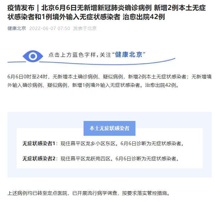 6月6日0时至24时,北京无新增本土确诊病例、疑似病例,新增2例本土无症状感染者;无新增境外输入确诊病例、疑似病例,新增1例境外输入无症状感染者。治愈出院42例。