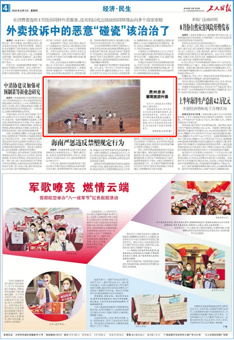 今天(8月4日),《工人日报》刊发新闻《贵州赤水暑期旅游升温》。