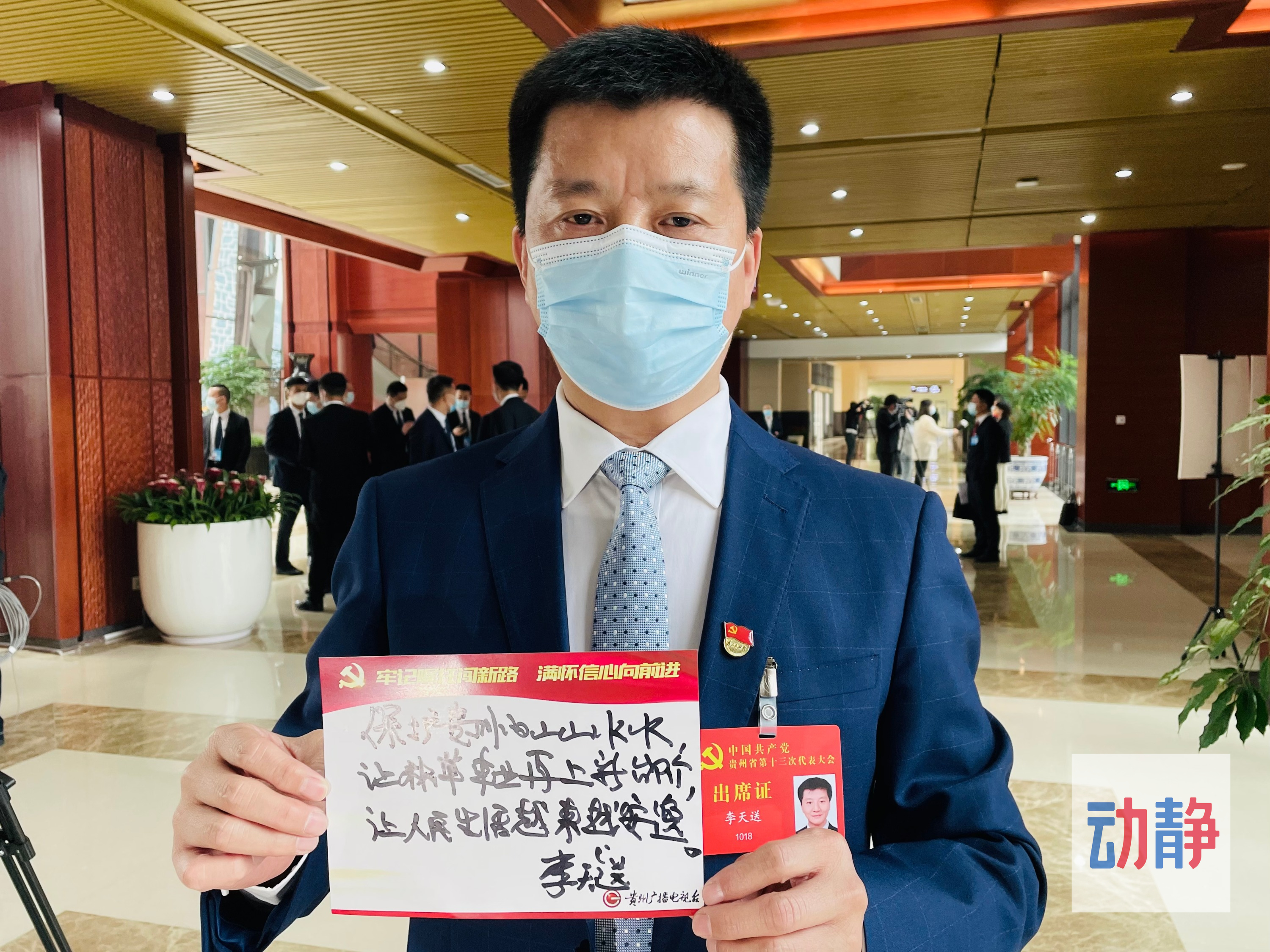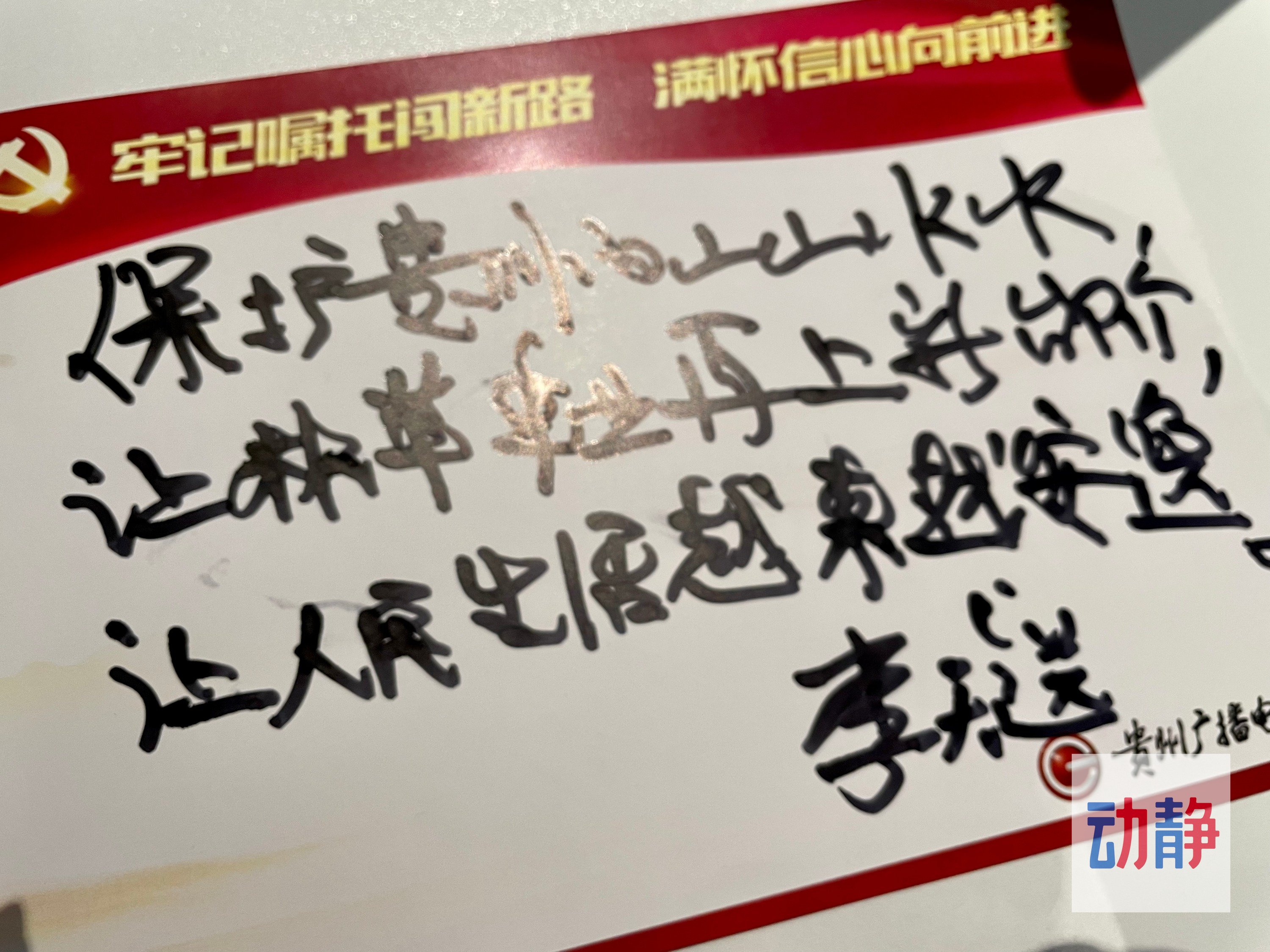 省党代会代表、国家林业和草原局驻贵阳专员办党组书记、主任李天送写下:“保护贵州的山山水水,让林草事业再上新台阶,让人民生活越来越安逸。”