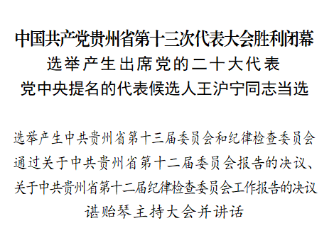 4月28日,中国共产党贵州省第十三次代表大会在贵阳胜利闭幕。大会选举产生了出席党的二十大代表,党中央提名的代表候选人王沪宁同志当选。